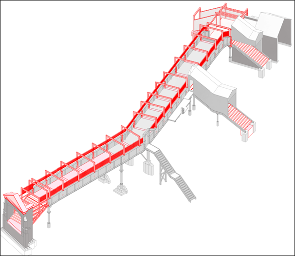 An innovative U-frame solution was developed, integrating new U-frames into the concrete deck out-pans to provide lateral restraint to the top chords of the main girders. This approach significantly enhanced the structural performance by preventing buckling under load, thereby increasing the overall stability and capacity of the footbridge.